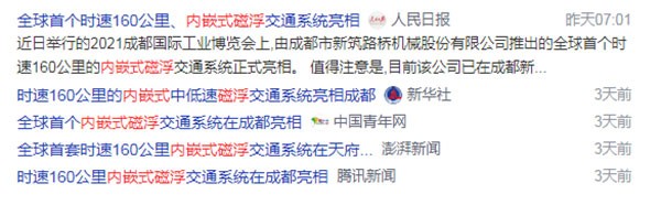 本次展会,中央广播电视总台(以下简称央视)、中新网客户端、中新网微博、中新社官方微博等媒体通过直播,邀请公司总工程师简炼为网友解读系统的工作原理、技术特点、应用场景、技术优势等;央视、中国交通频道、四川电视台、成都电视台通过多个频道多个栏目以视频新闻的方式展开传播报道;四川新闻频率、四川交通广播在多个时段播报相关新闻;人民网、新华社、光明网、中新网、今日头条及其他媒体以图文、视频、新媒体展开传播报道。公司推出的“全球首个160公里内嵌式磁浮交通系统”成为新闻热门话题,由微博官方账号“爱看头条”主持的#首个内嵌式磁浮交通系统亮相成都#阅读量达152.3万;多个媒体官方抖音账号发布了相关内容,热度超过240万,登上同城榜热搜;截至目前百度检索结果显示,围绕“内嵌式磁浮交通系统”的直接新闻报道超过150篇次,搜索结果前20页均为此次活动相关报道,相关结果约30多万个。媒体传播效果达预期,借助成都工博会平台,公司磁浮系统赢得关注,为市场开拓奠定了坚实基础。